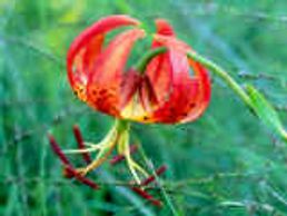 The Turk's-cap Lily, Lilium superbum, is a member of the lily family. It has an orange flower with brown spots, grows on the edges of wetlands, and blooms in July.